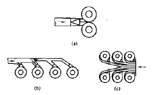 圖(a)是最簡單的入口并聯方式,在進氣管中氣體和灰塵的流動是對稱的,兩個除塵器中的工作情況相同,效率和阻力相同;圖(b)所示連接,難以保證所有支管入口壓力相同,但安裝比較方便;圖(c)每經過一個除塵器的入口之后,主管道就會縮小一些,進入并聯的除塵器氣流可以自我補償,達到氣流基本平衡;