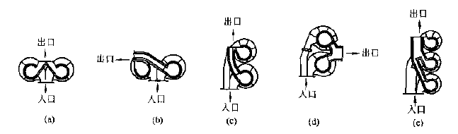2.2排氣管并聯方式,并聯除塵器與排氣干管連接時,往往為了回收壓力而采用蝸卷式出口。因為這種出口的方向可以隨意安排,故可根據具體情況采用不同的連接方式,見圖二。