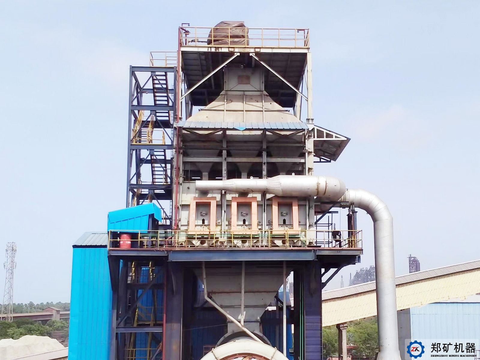 豎式預熱器和豎式冷卻機為河南鄭礦機器專利技術產品,具有入窯物料預熱效率高和出窯石灰冷卻效率高等特點,產品單耗底、節能,節省場地面積。石灰活性高,白度好,均勻穩定。窯尾出預熱器廢氣采用機力空冷機,大幅降低入收塵器廢氣溫度,同時布袋收塵器入口加裝冷風口,做應急使用,防止異常情況下高溫氣體燒壞收塵濾袋。